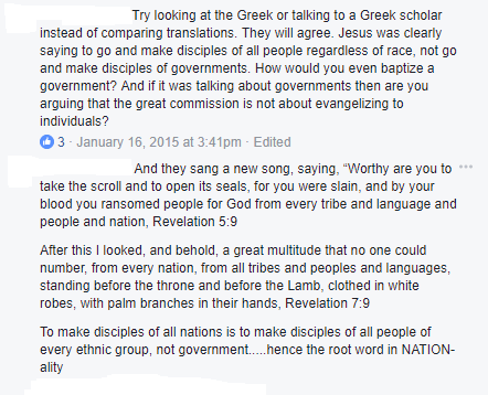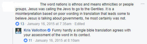 Resistance against the false doctrine of these NAR leaders is usually futile. If the foundation is wrong, the whole house comes tumbling down. One reason false teachers cannot receive biblical correction is that their whole ministry will collapse. They would have to withdraw all their books and courses (a main source of their income) They would have to step down from ministry, repent of teaching error, and study the word of God in context (no more income) This would not only be a humbling experience, but also derive them of any income based on ministry. Pride and mammon have a solid grip on these charlatans. Someone tries to point out to Kris what this verse means: