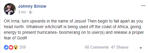 Below we have another attempt at commanding hurricanes to change direction that failed. How Johnny knew the cause was witchcraft from Africa, is anyone’s guess. But what could we expect from a prophet that hears God speaking through license plates (see part 1)