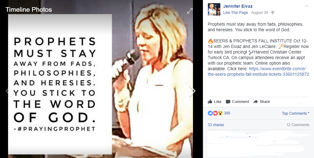 Jennifer Eivaz associate Pastor and prophet from Harvest Christian Center in Turlock, warns us to stick to the word of God, and we agree; just a pity she does not heed her own warning.