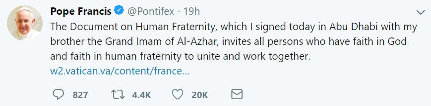 HFD: “From our fraternal and open discussions, and from the meeting that expressed profound hope in a bright future for all human beings, the idea of this Document on Human Fraternity was conceived.”